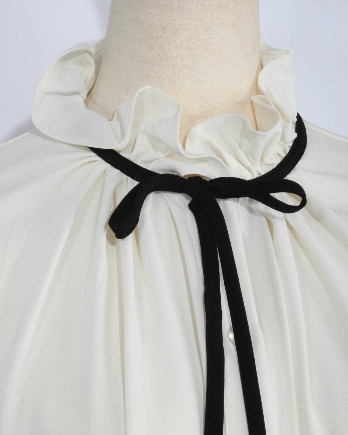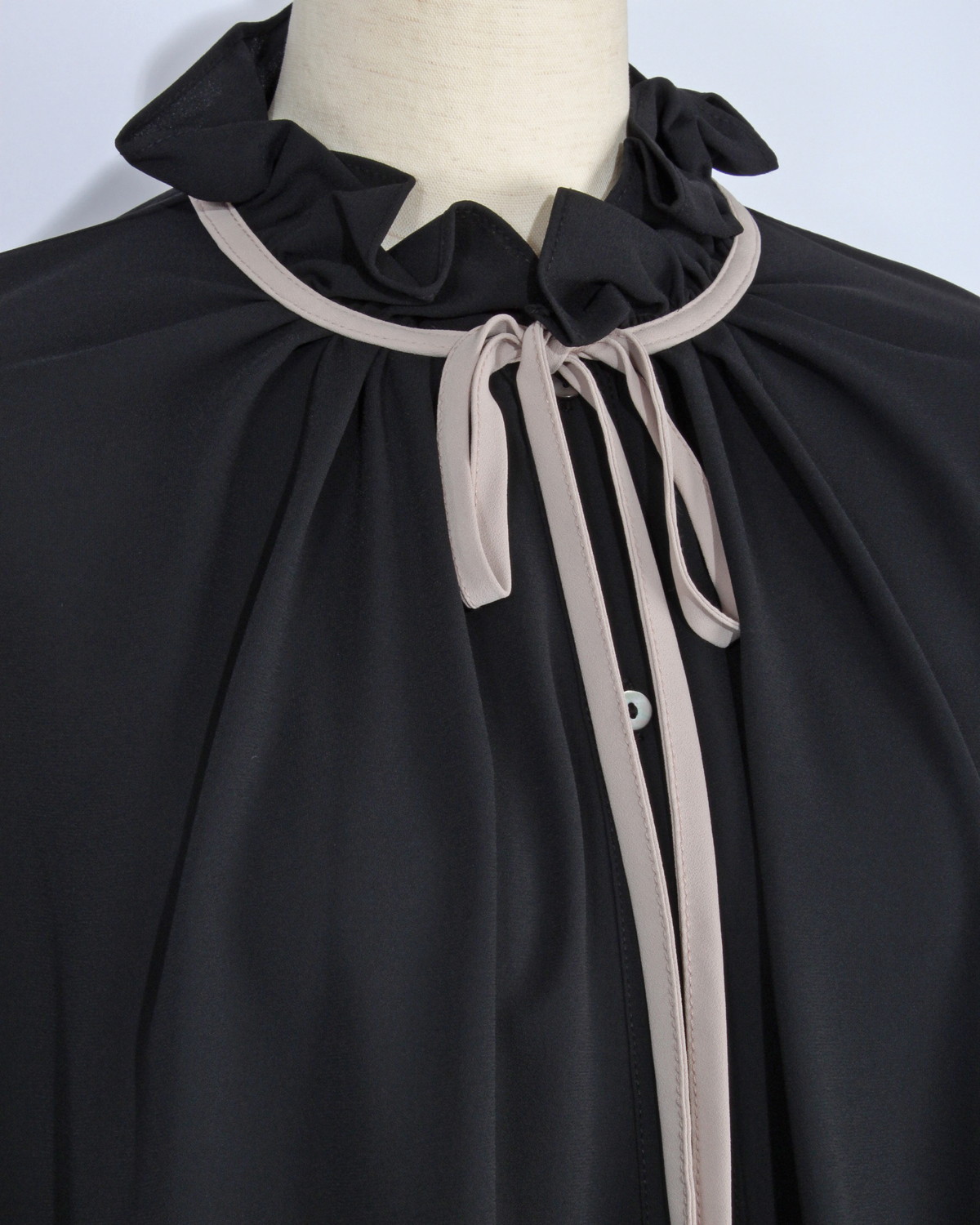 立ち上がりの美しいフリルネックには、本体と異なる配色(黒)のパイピングを施し、デザインにメリハリをプラス。