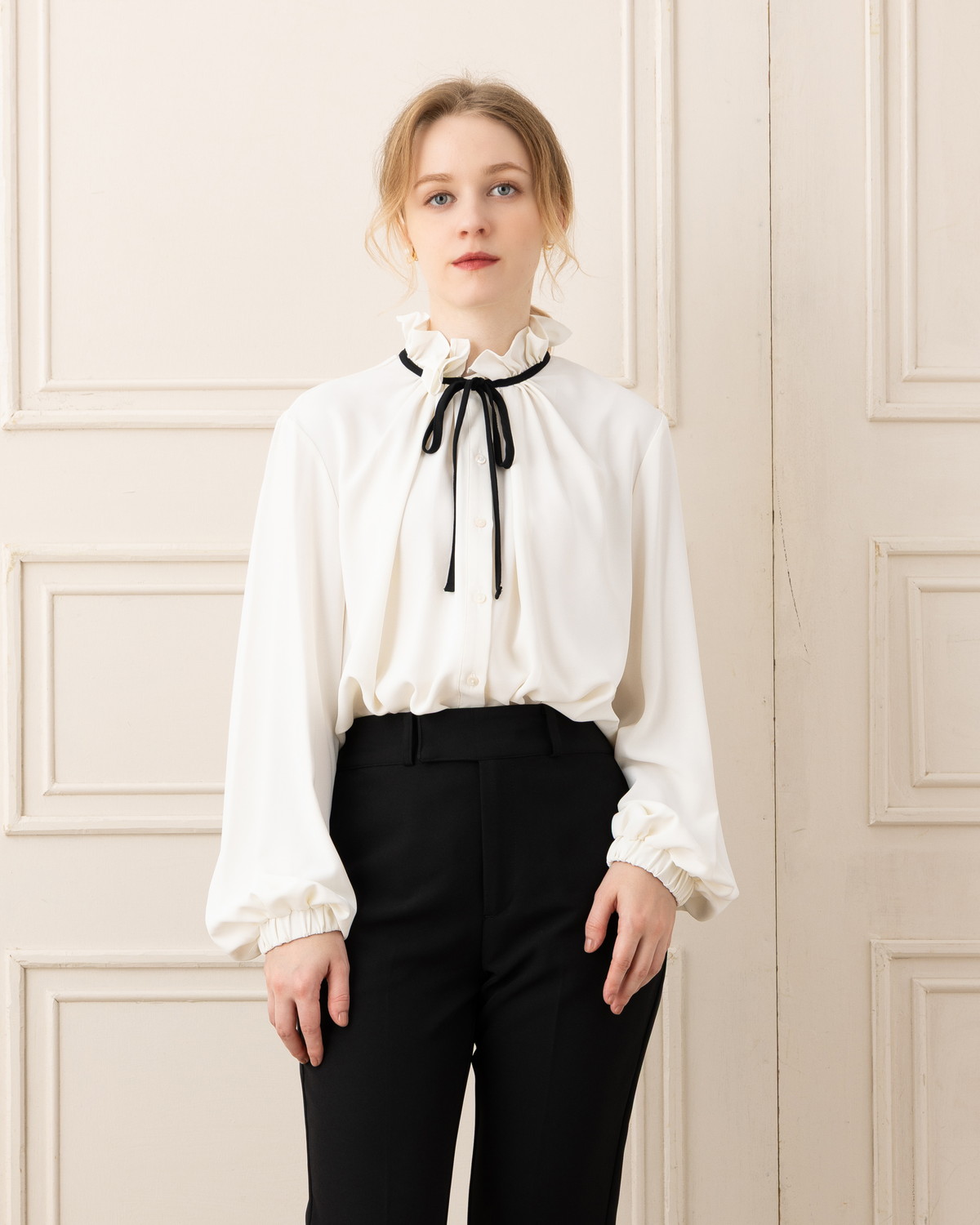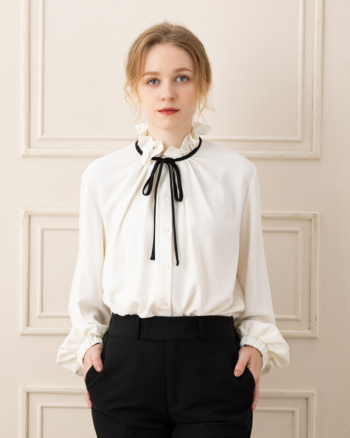 【エレガントなディテールで魅せる、上品レディブラウス】