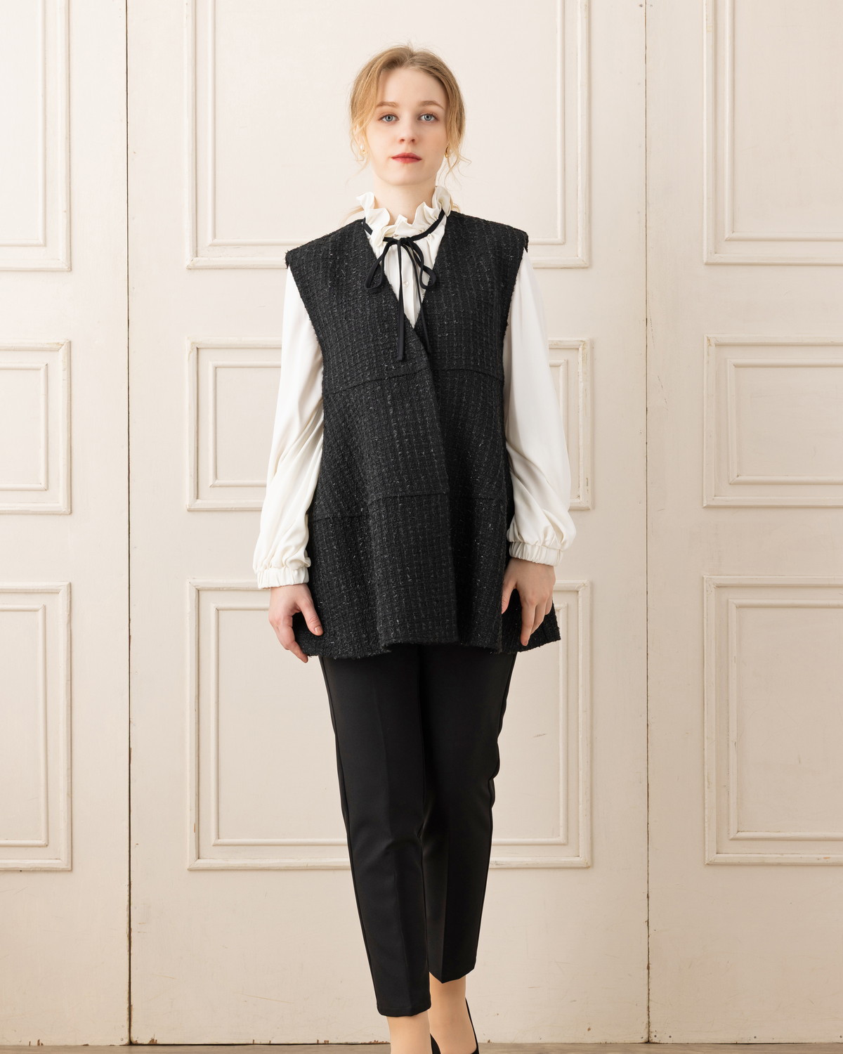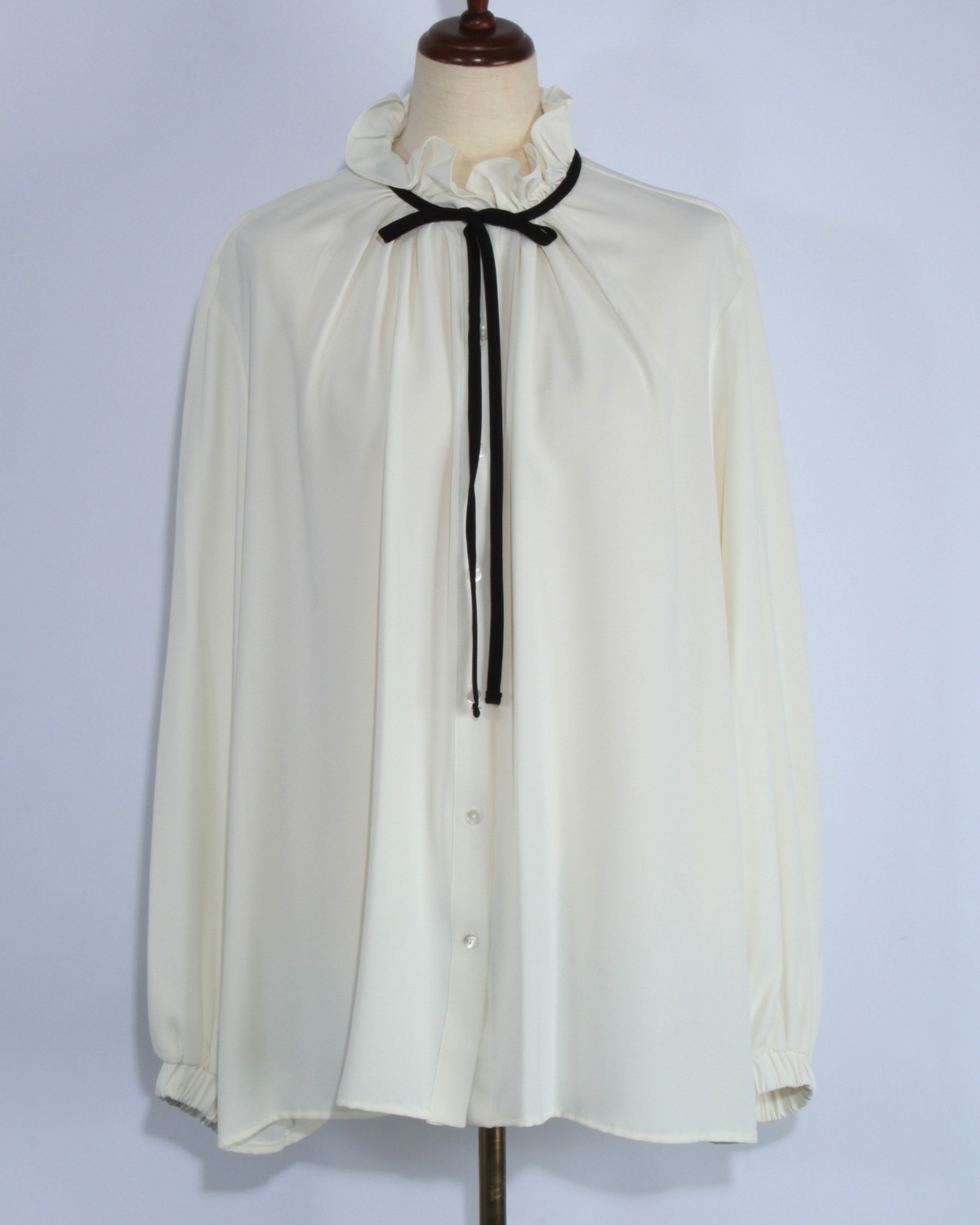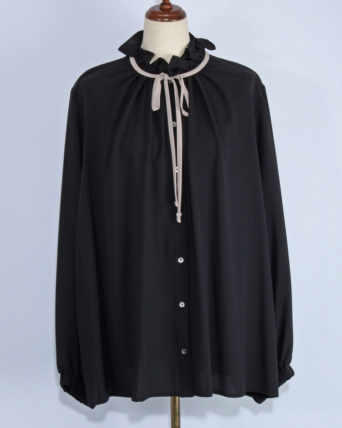 上質なジョーゼット素材を使用した、大人の女性にふさわしいエレガントなブラウスです。首元と袖口にあしらわれたディテールが、顔周りを華やかに演出し、一枚で洗練されたコーディネートが完成します。