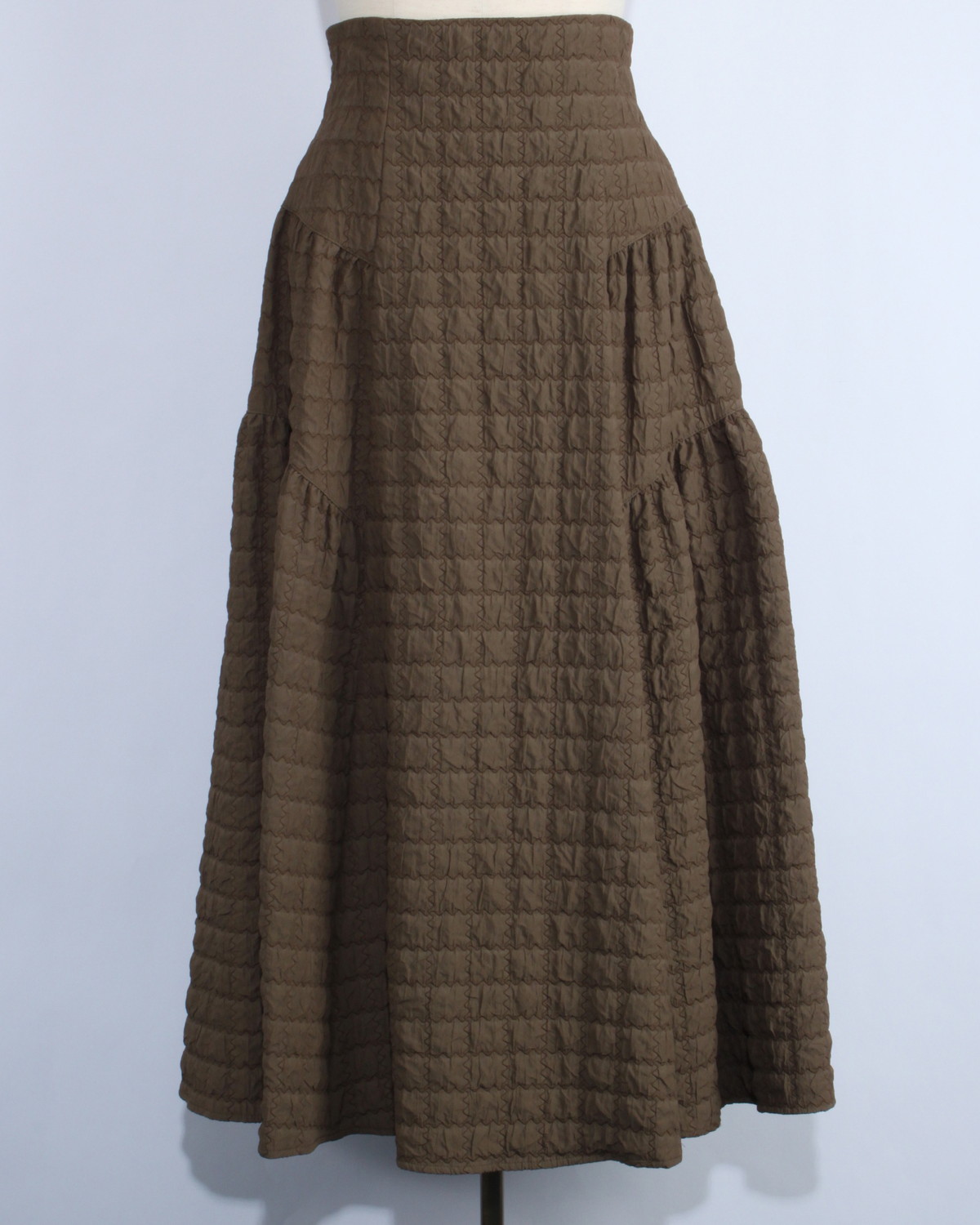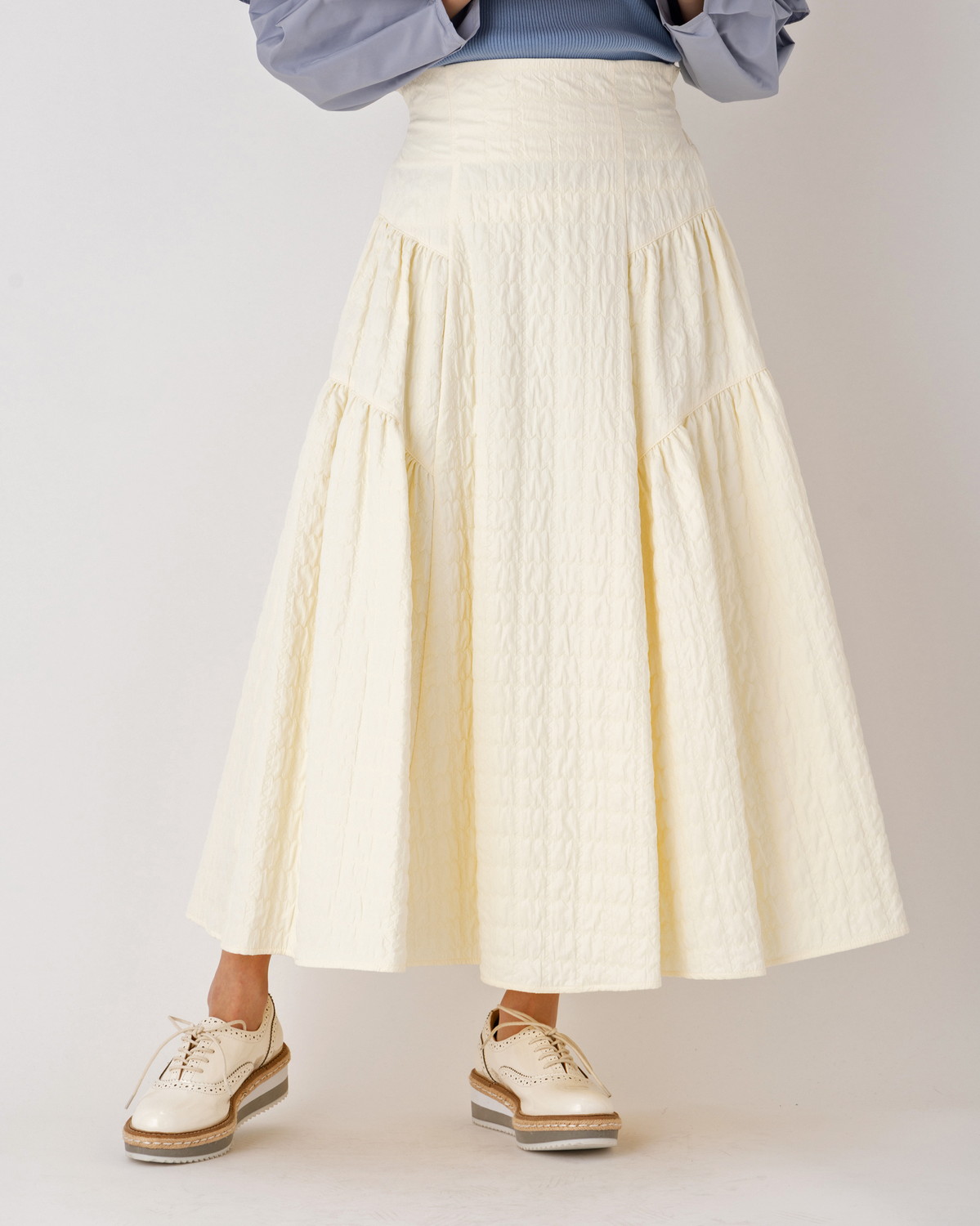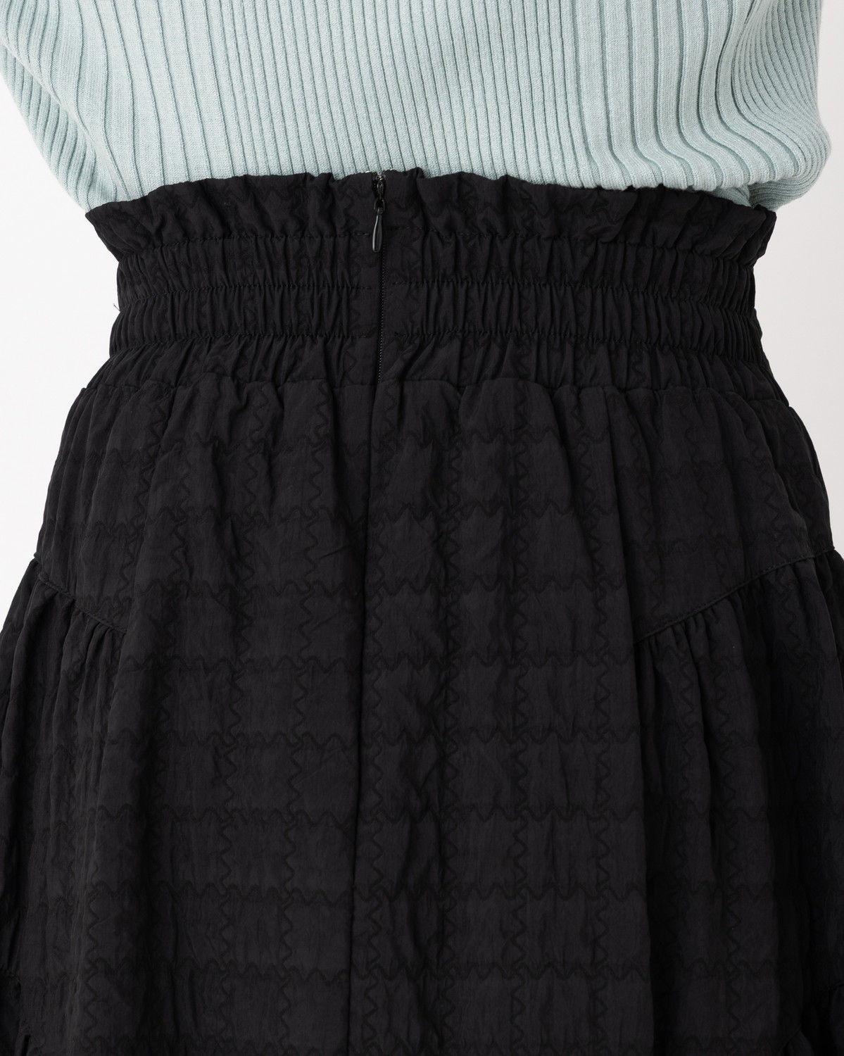 凹凸のあるポコポコとした表情が目を惹く、トレンドのふくれジャガード生地を贅沢に使用しました。 単色ながらもしっかりとした存在感があり、シンプルなトップスと合わせるだけで、奥行きのある洗練されたコーディネートが完成します。