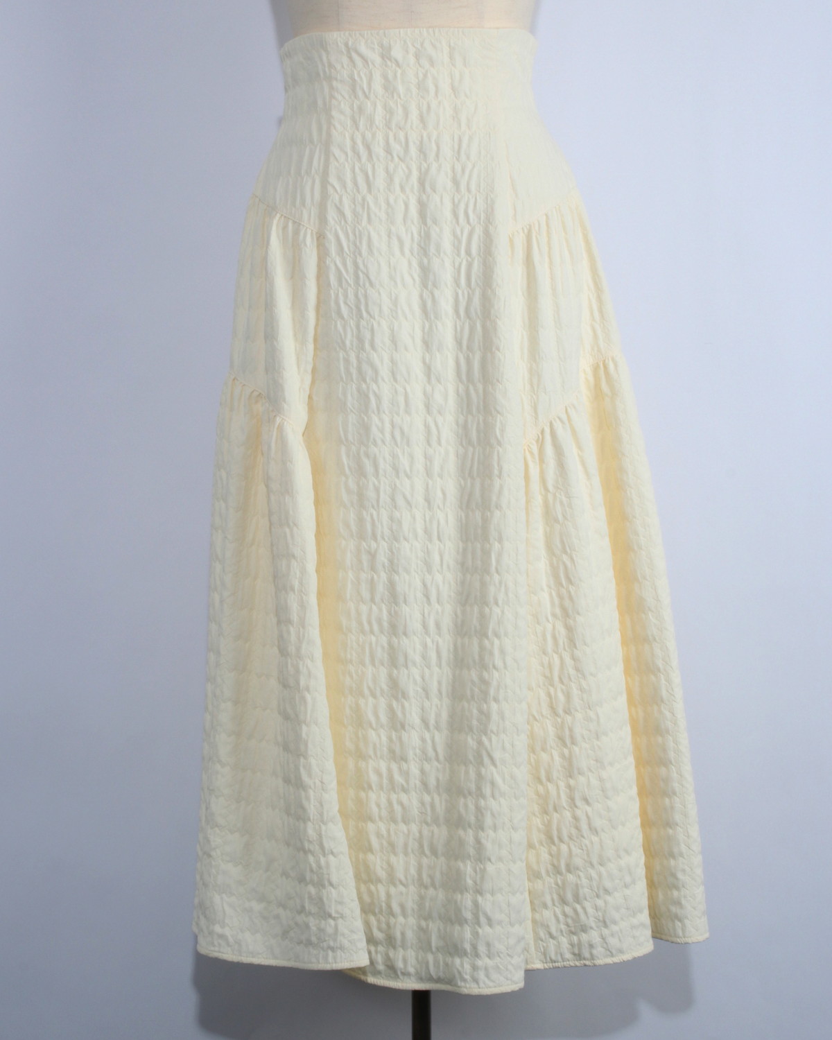 ウエストラインを高く設定したハイウエスト設計が、脚長効果を最大限に発揮。 腰回りはすっきりと、ヒップ下からカーブを描くようなティアードデザインを施すことで、お腹周りのボリュームを抑えつつ、裾に向かってドラマチックに広がる贅沢なフレアシルエットを実現しました。