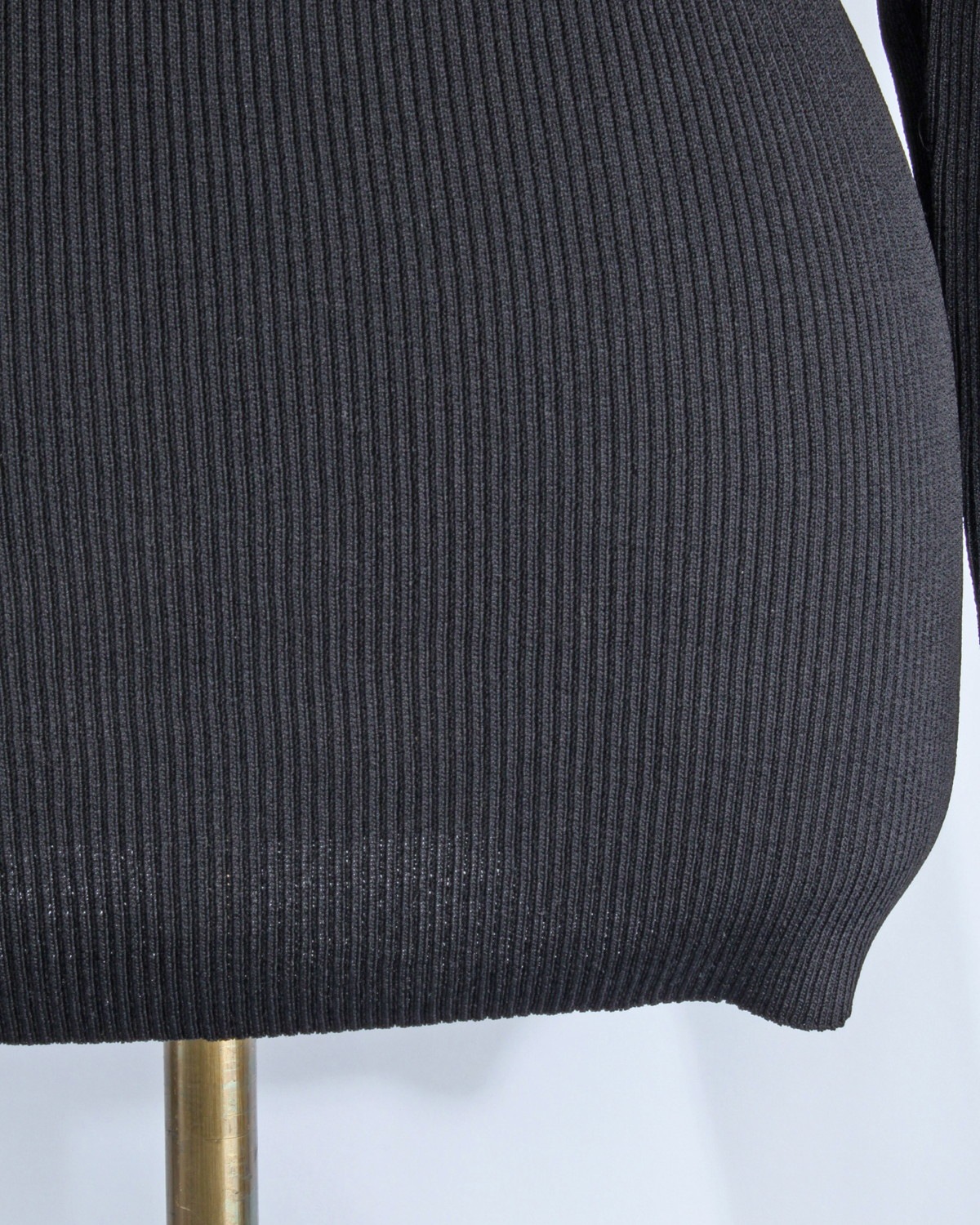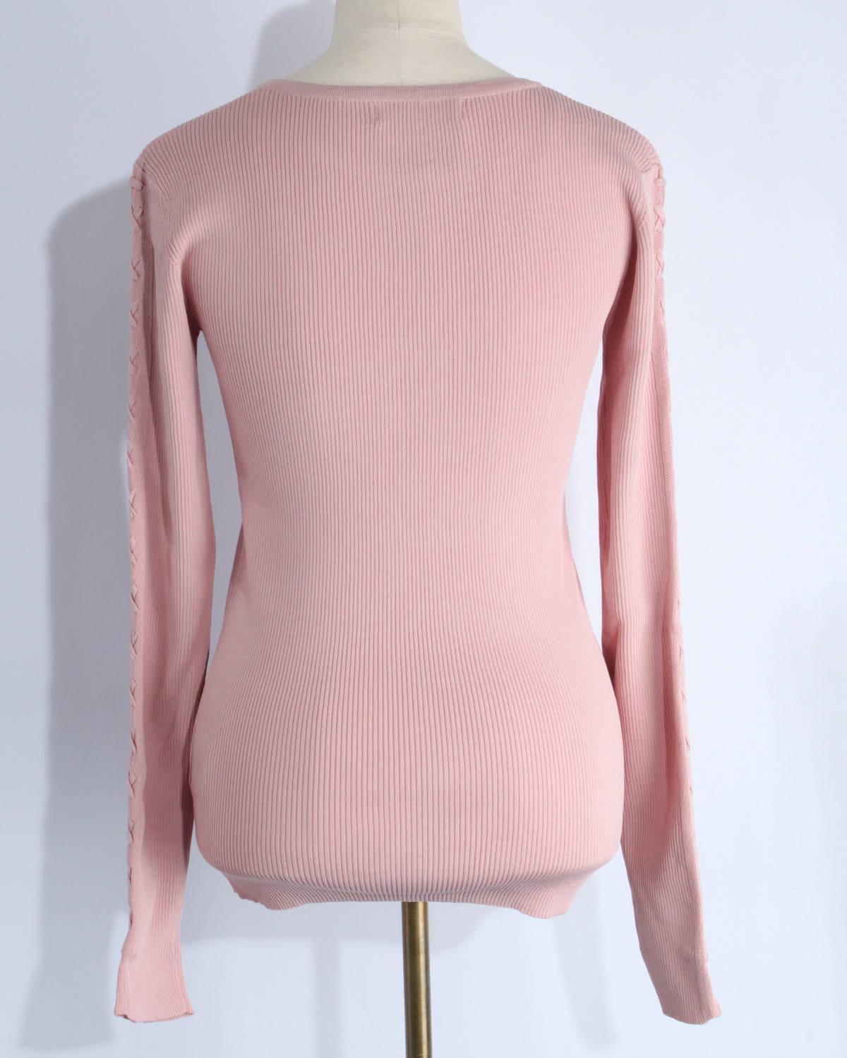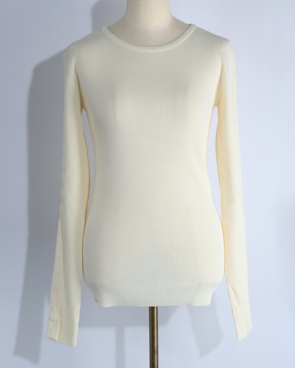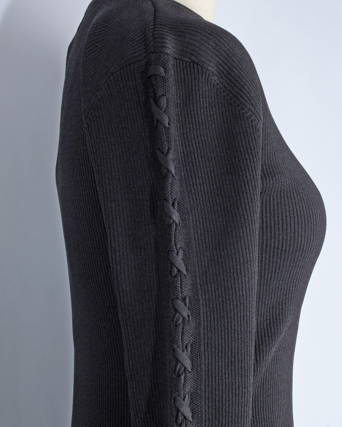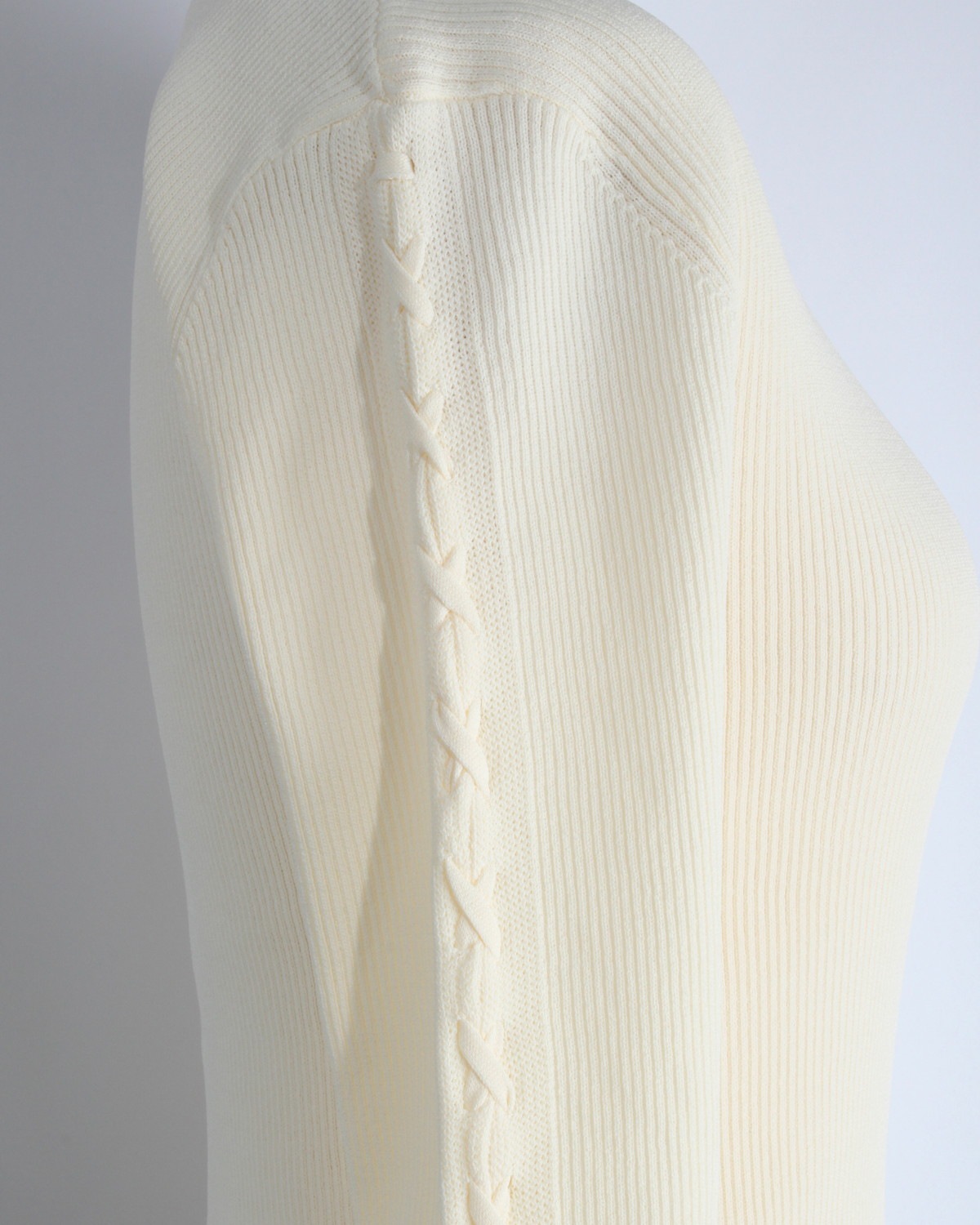 縦のラインを強調する視覚効果: 直線的に配置されたレースアップが、腕を長く、細く見せるデザイン。リブ素材の縦線と相まって、上半身を驚くほどスマートに整えてくれます。