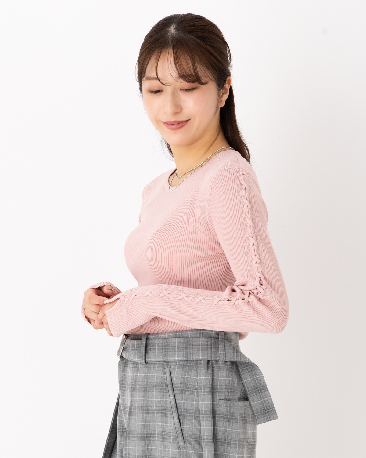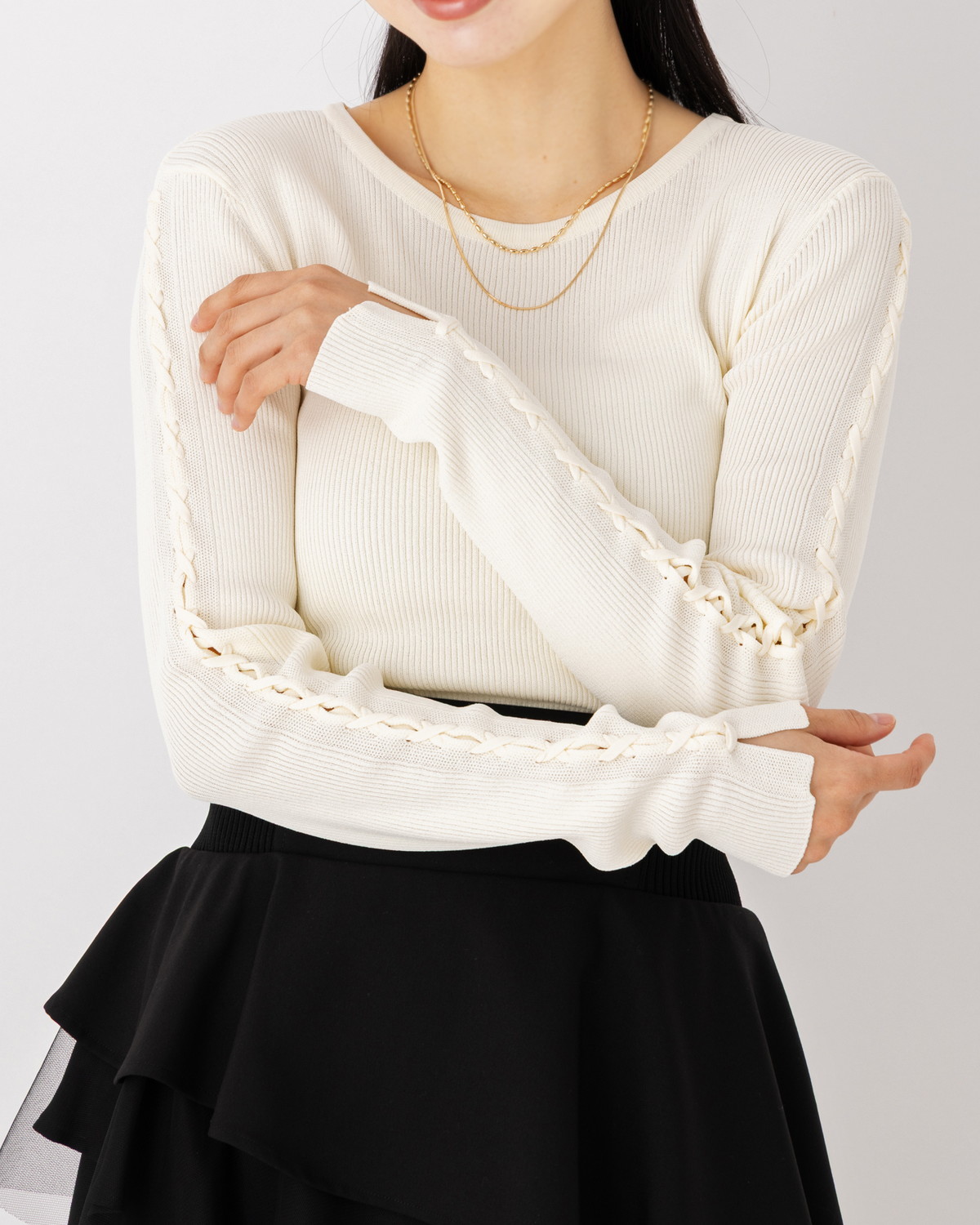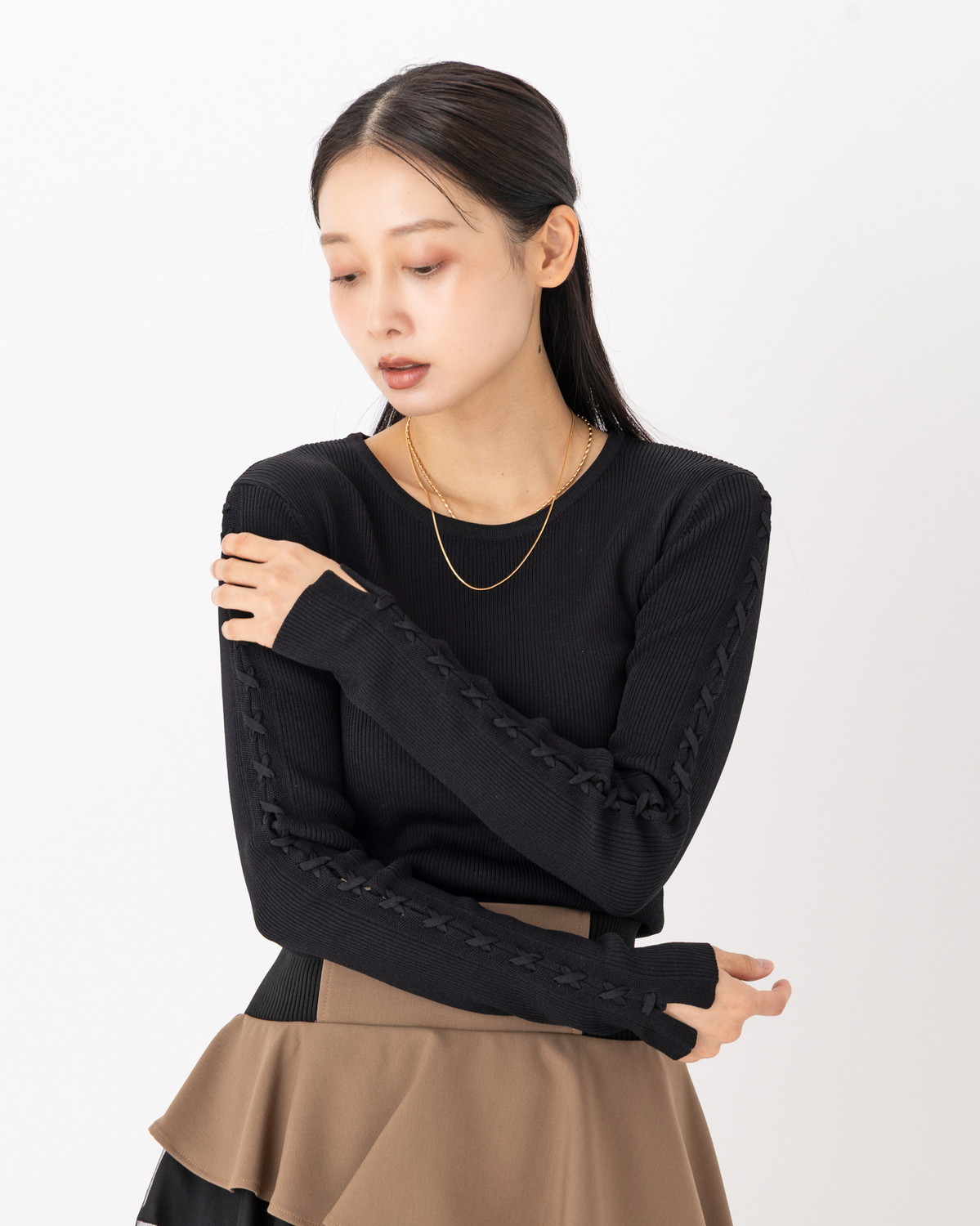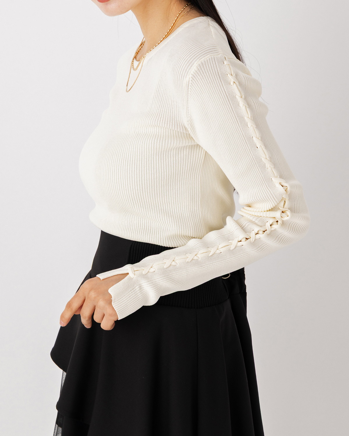 【手元に、繊細なスパイスを。レースアップがつくる、可憐でモードな表情のリブニット】