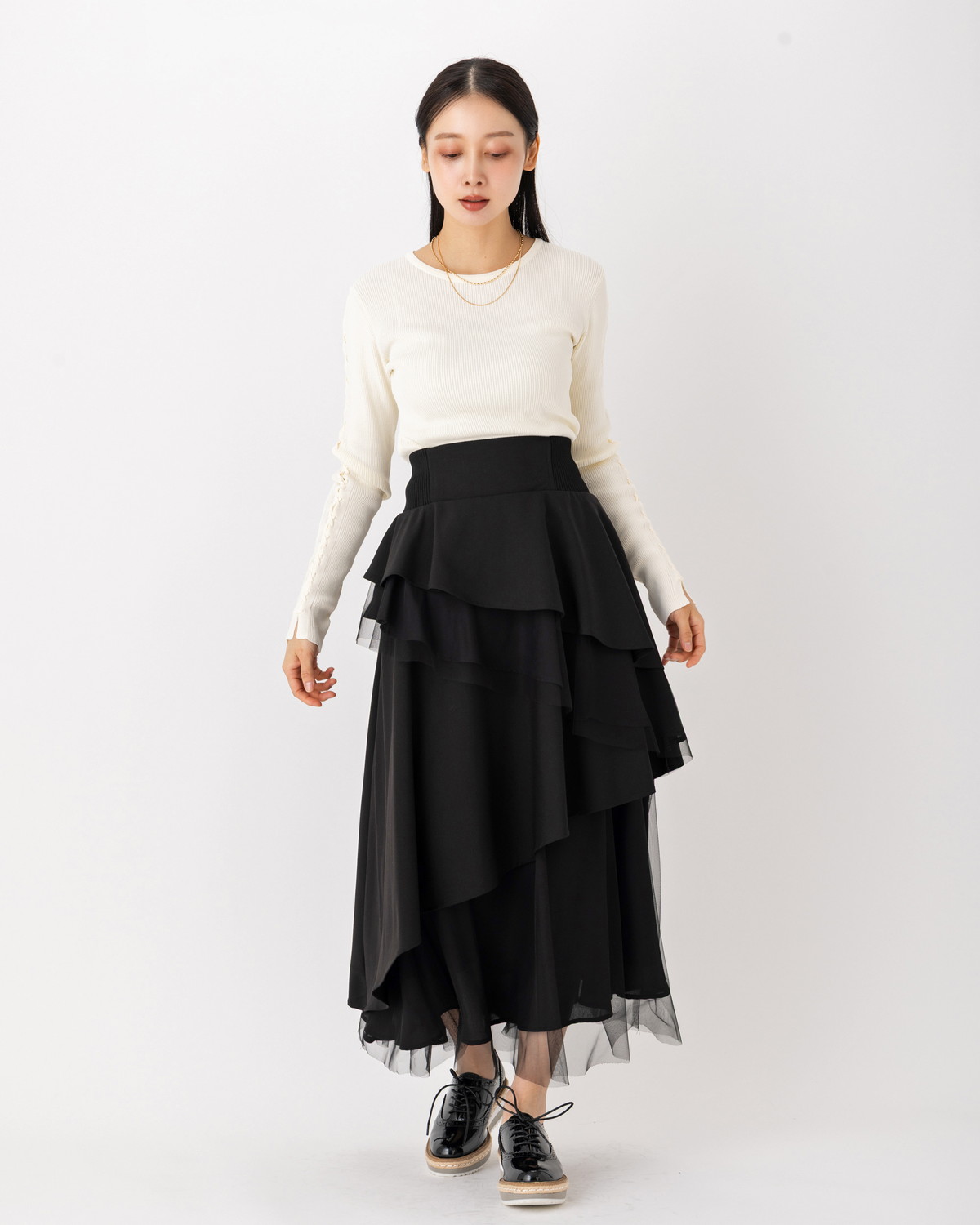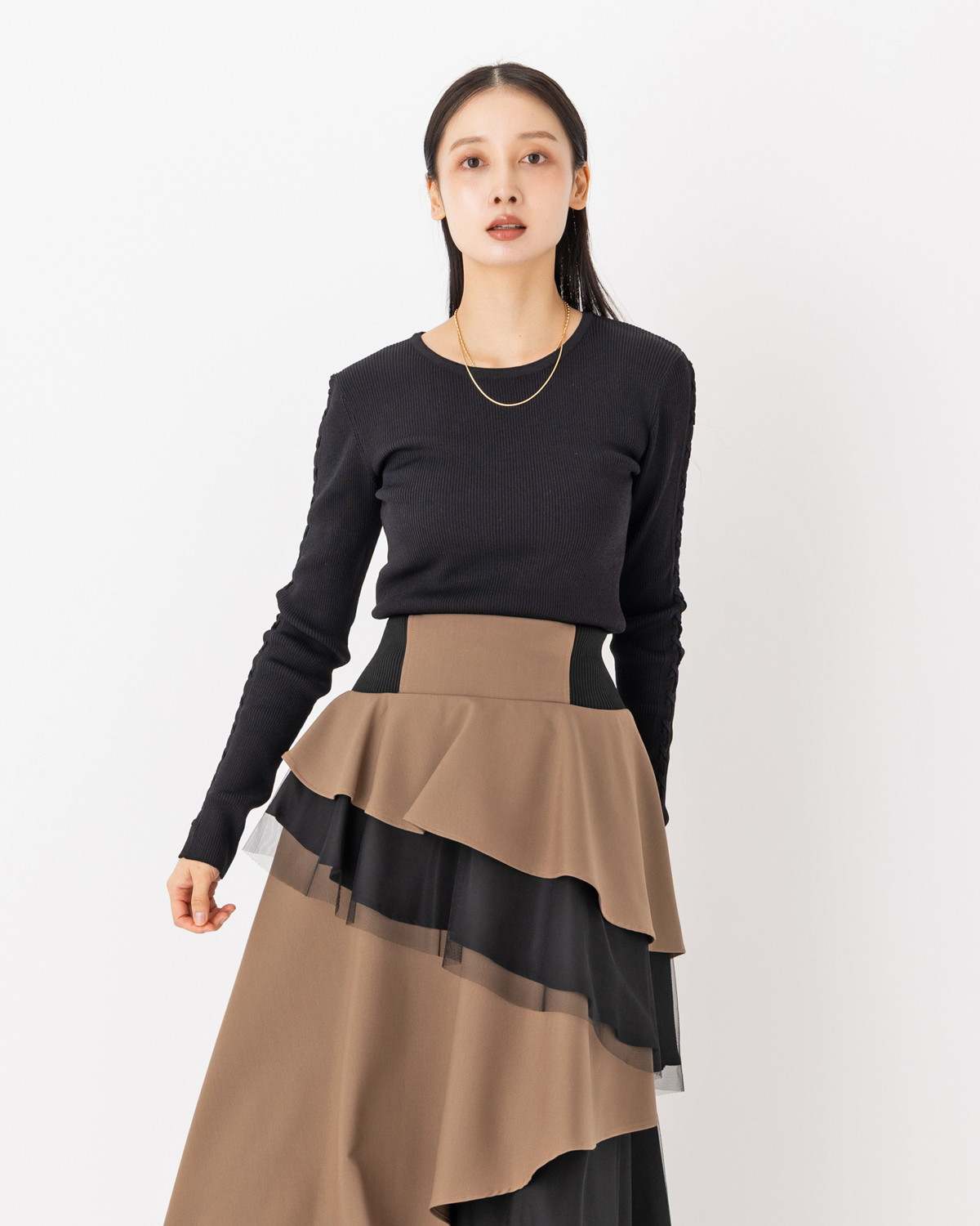 構築的なフェミニン: 甘くなりがちなレースアップを、タイトなリブニットに載せることで都会的なモードスタイルへ昇華。シンプルにデニムやスラックスと合わせるだけで、完成度の高い装いが叶います。