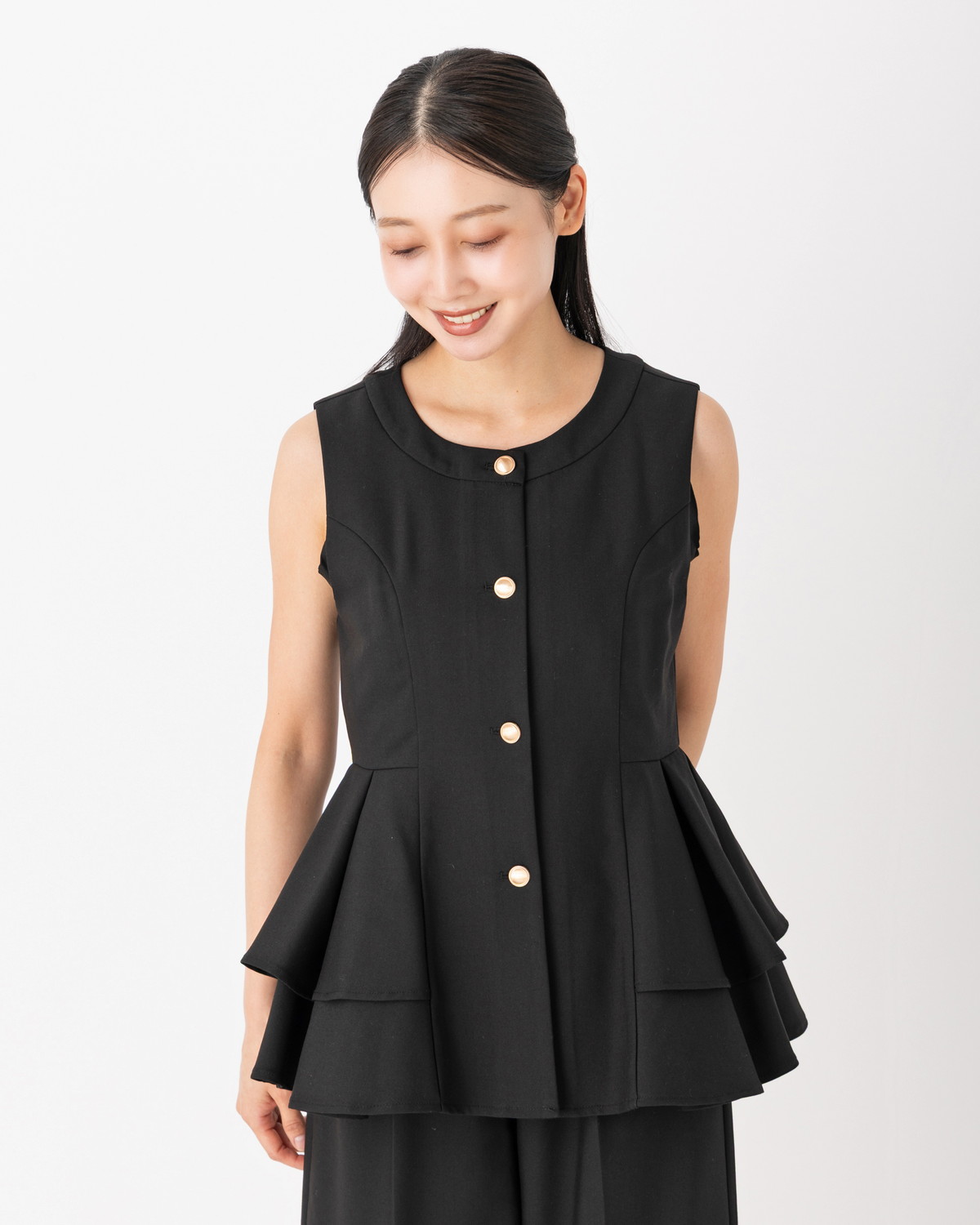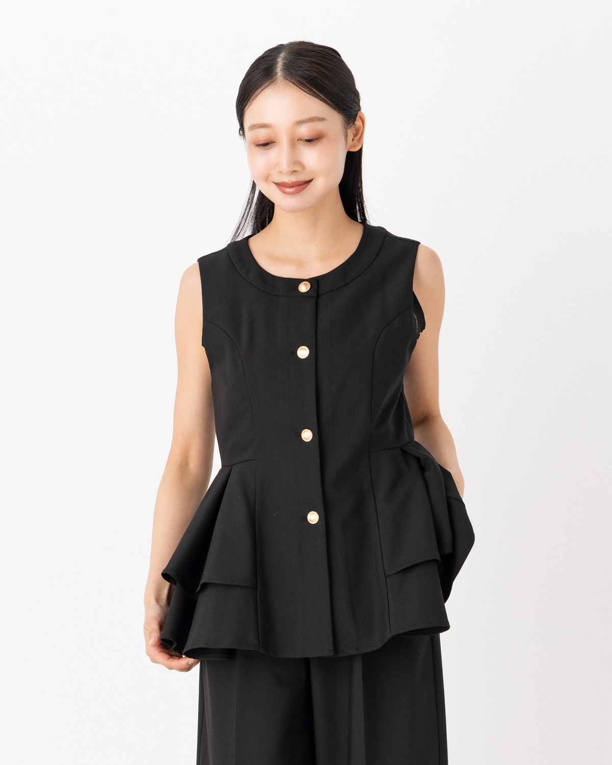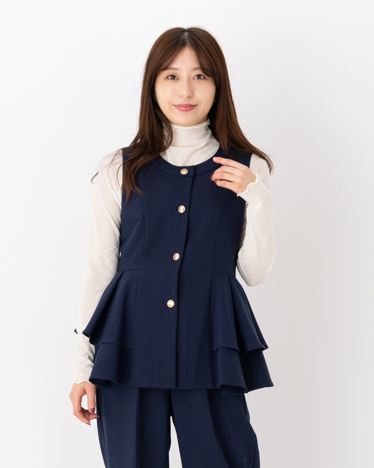 いつものコーディネートに合わせるだけで、全体のバランスがきれいにまとまるペプラムジレ。