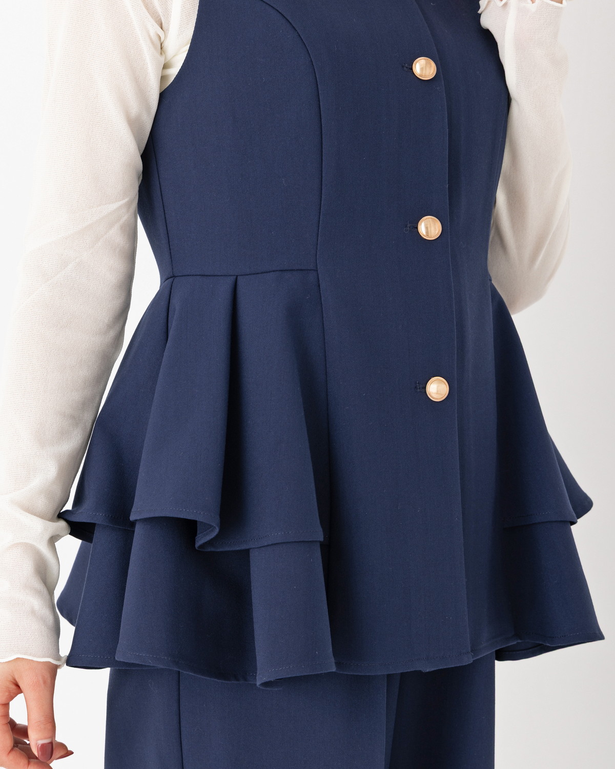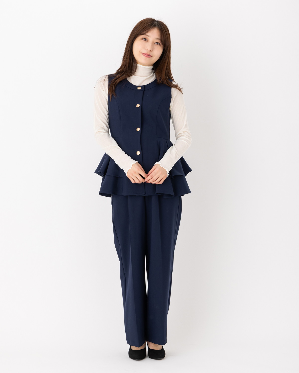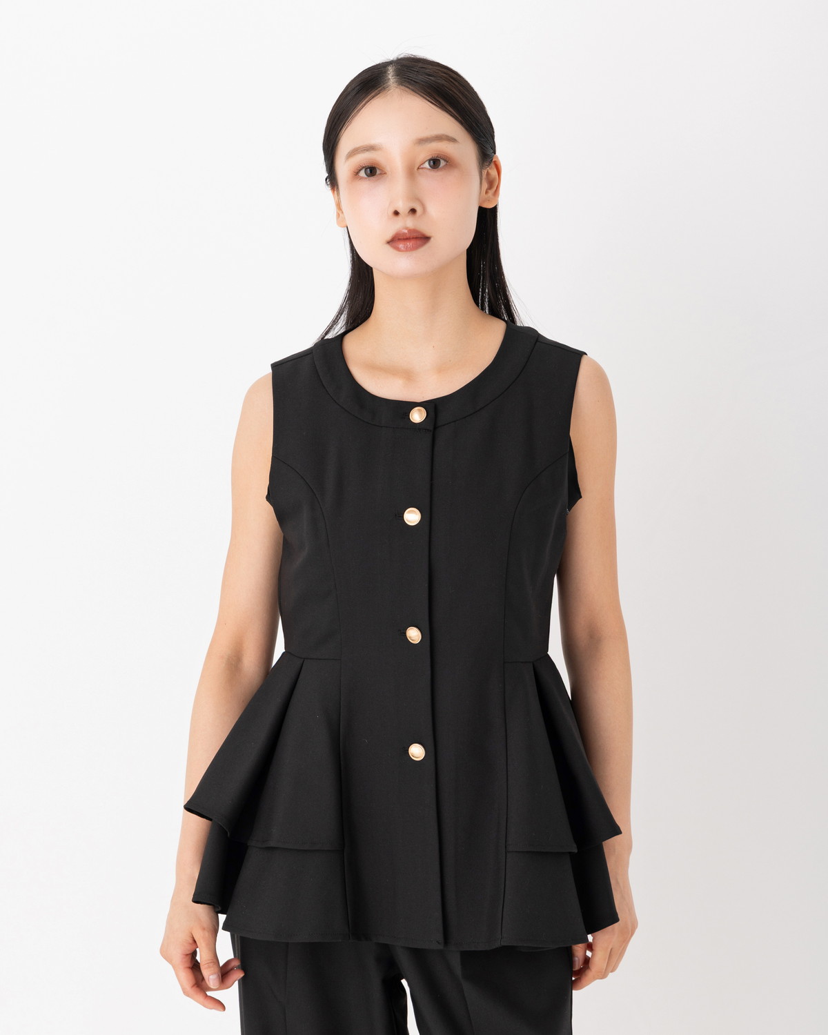 いつものコーディネートに合わせるだけで、全体のバランスがきれいにまとまるペプラムジレ。