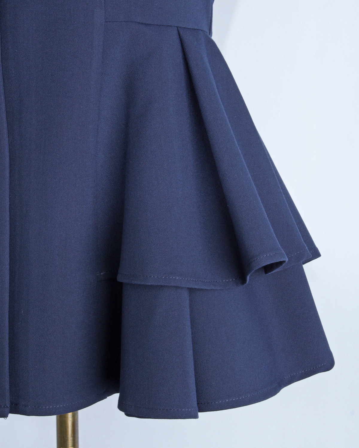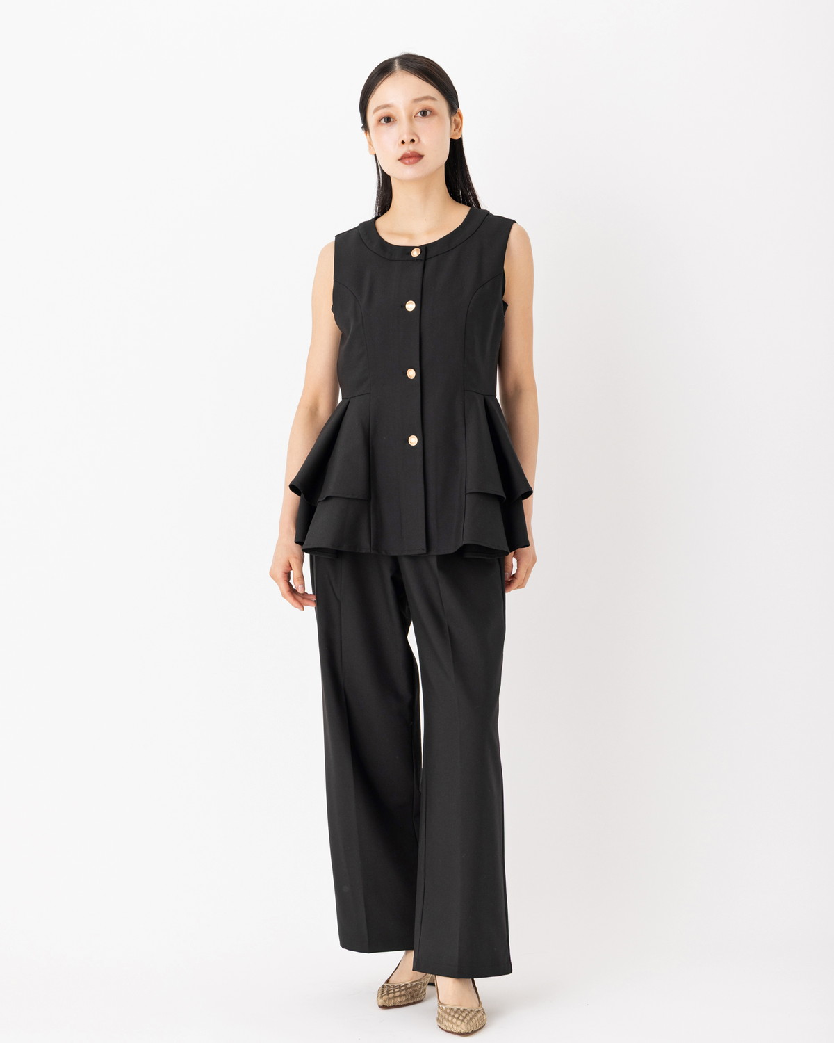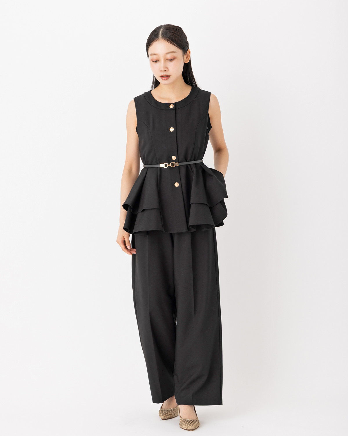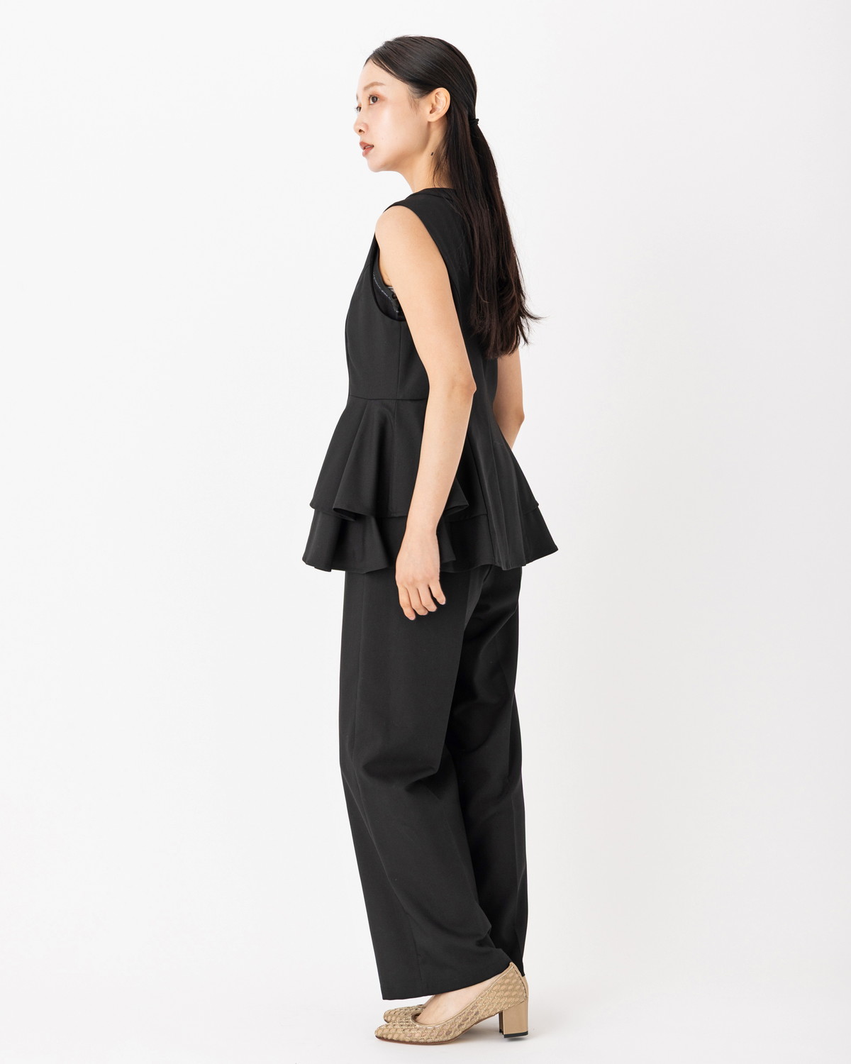 高めのウエスト位置から広がる2段のペプラムが、気になる腰回りをカバーしつつ、着るだけですっきりとしたバランスに仕上げてくれます。