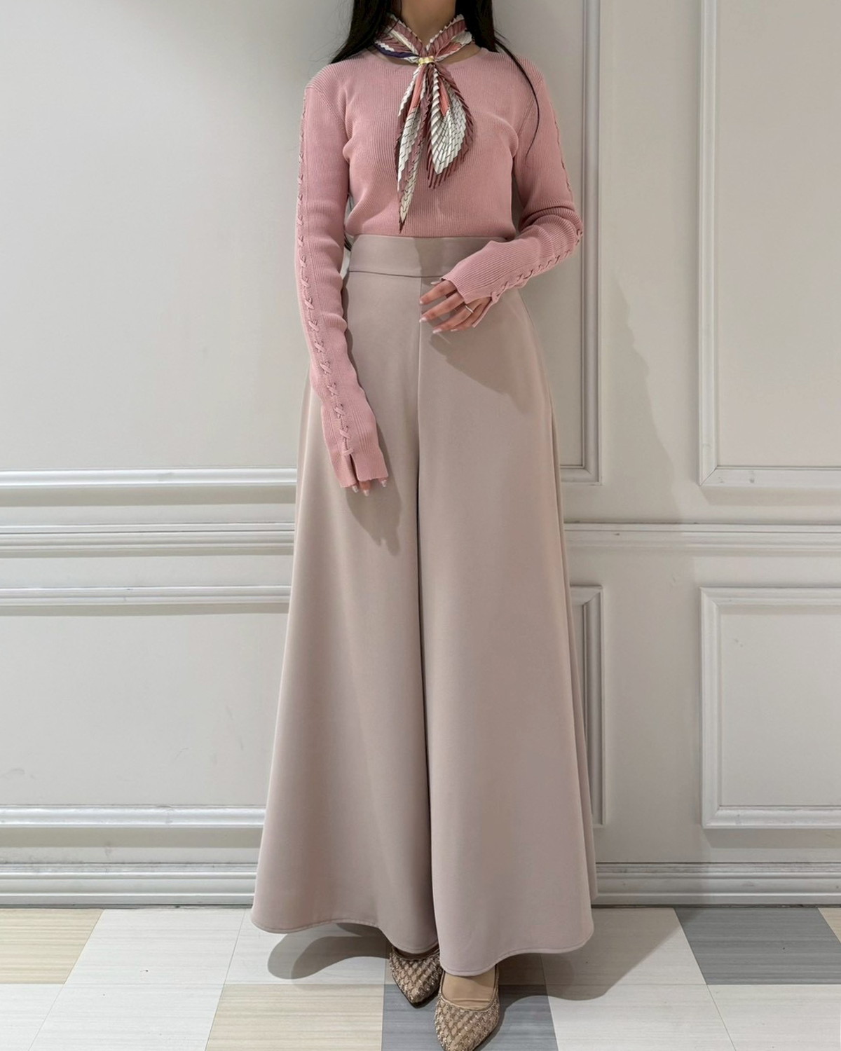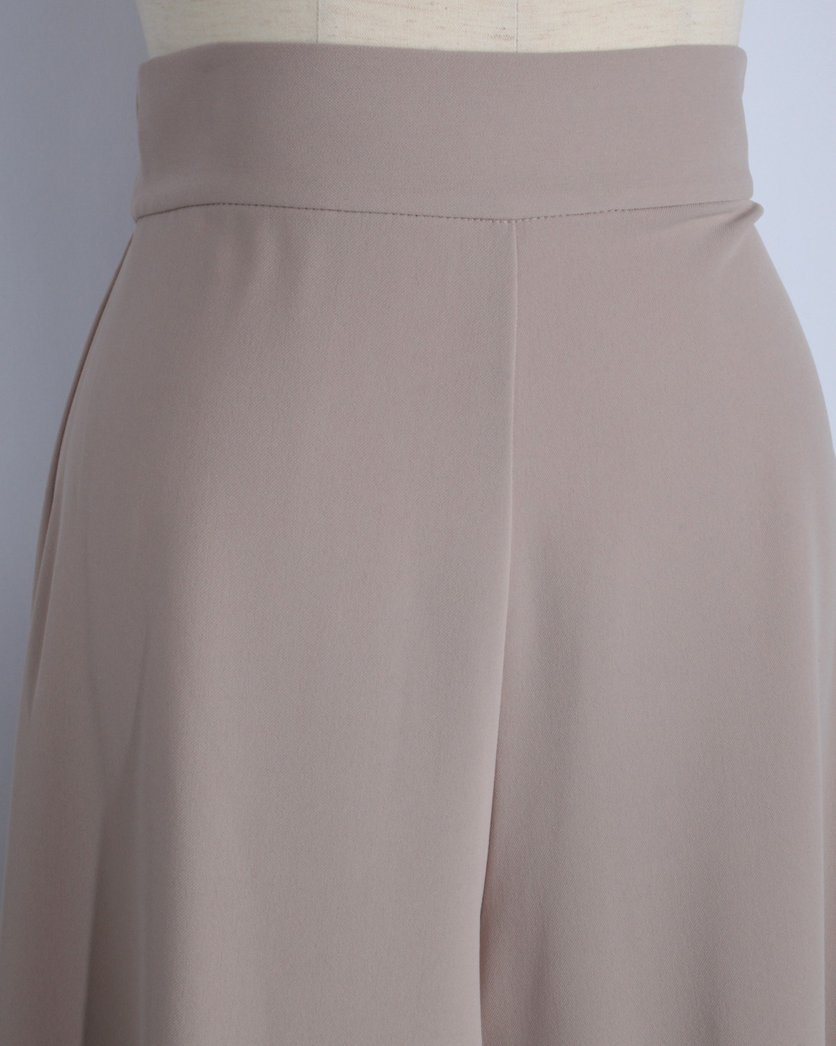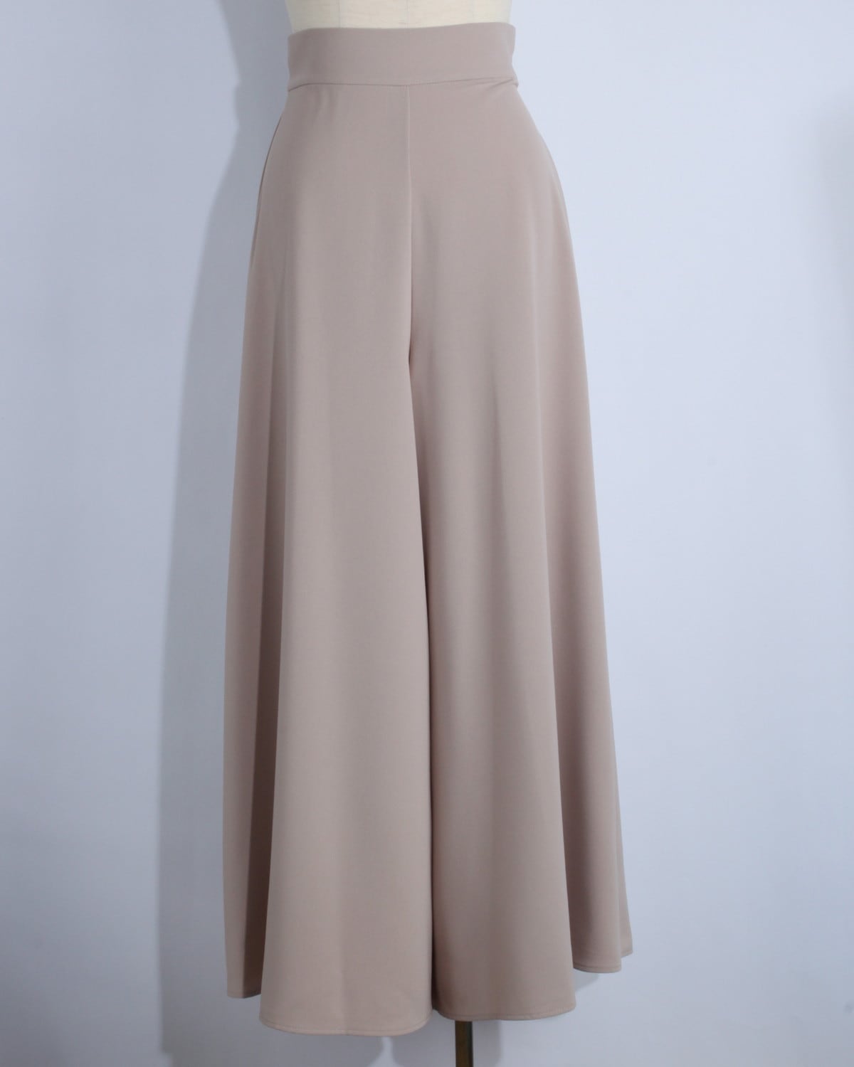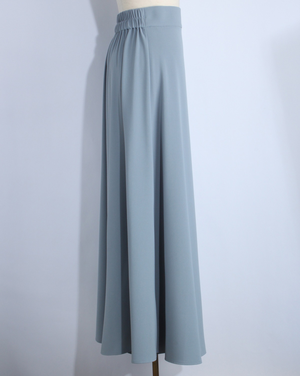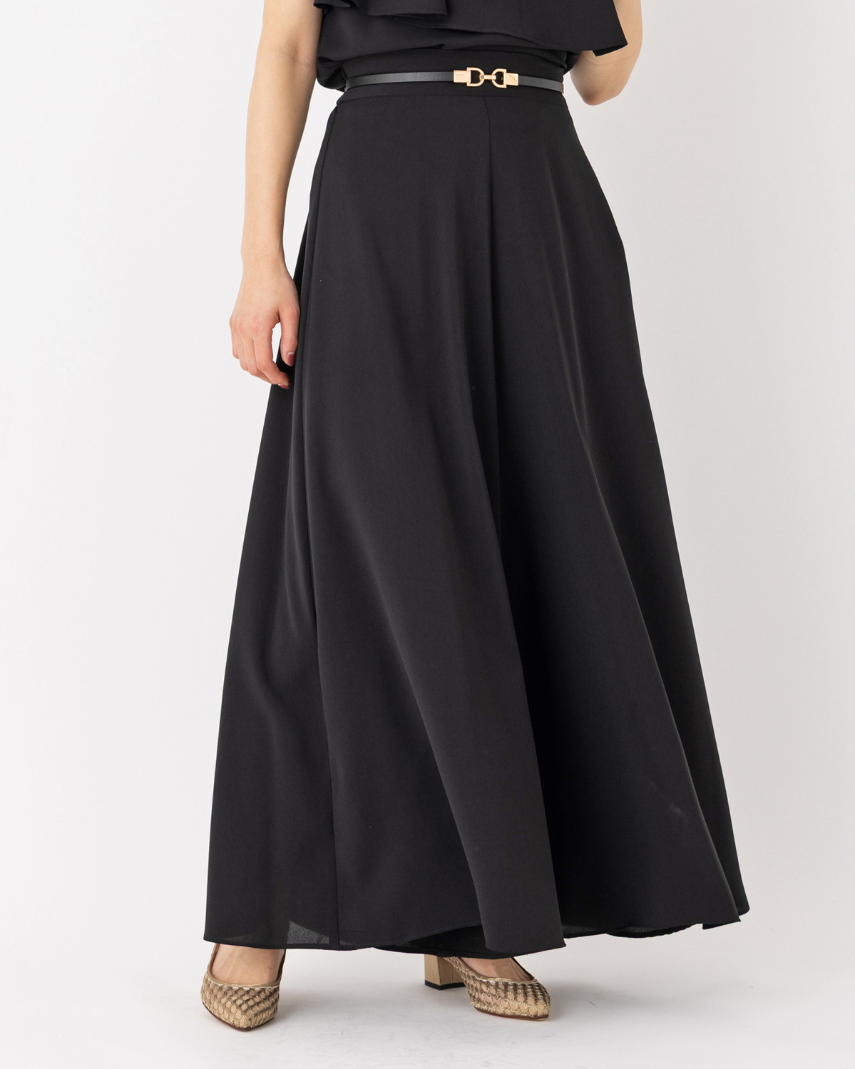 美ラインをキープする素材感: 適度な厚みとハリがあり、フレアの造形美をしっかりとキープ。肉感を拾いにくく、すとんと落ちるような綺麗なシルエットが続きます。
