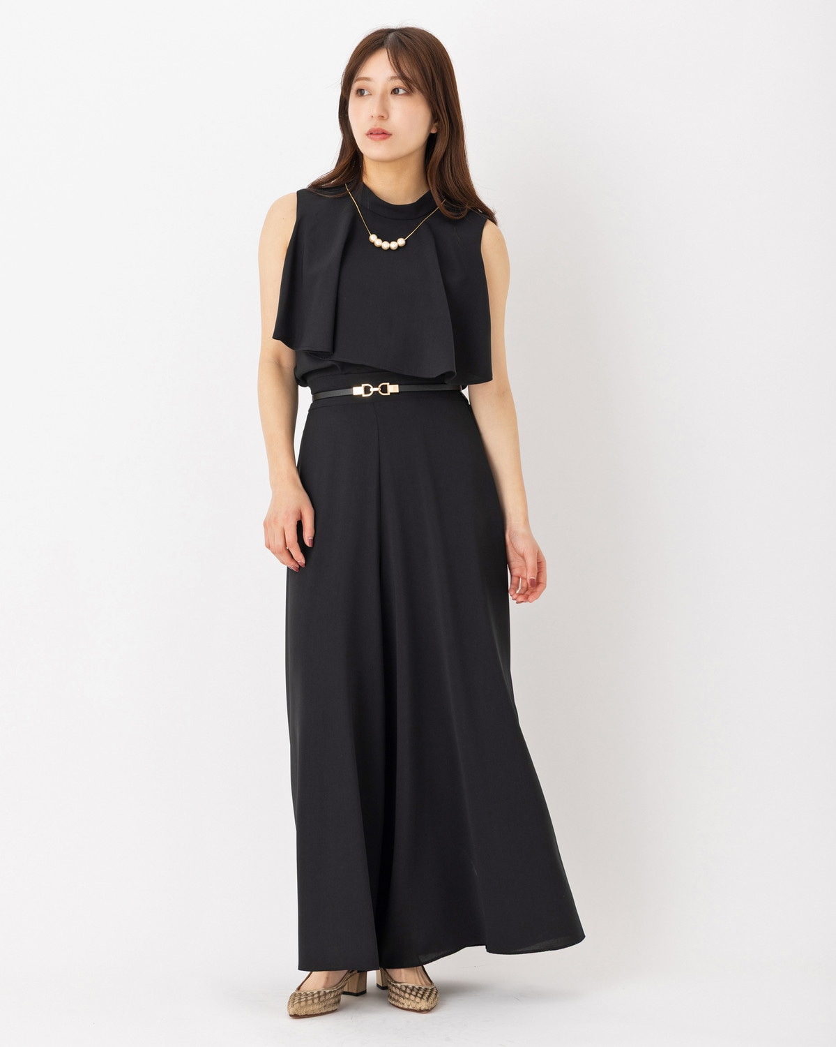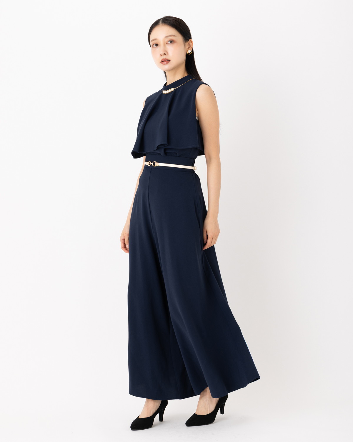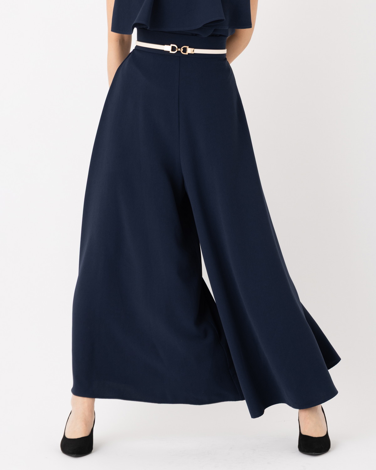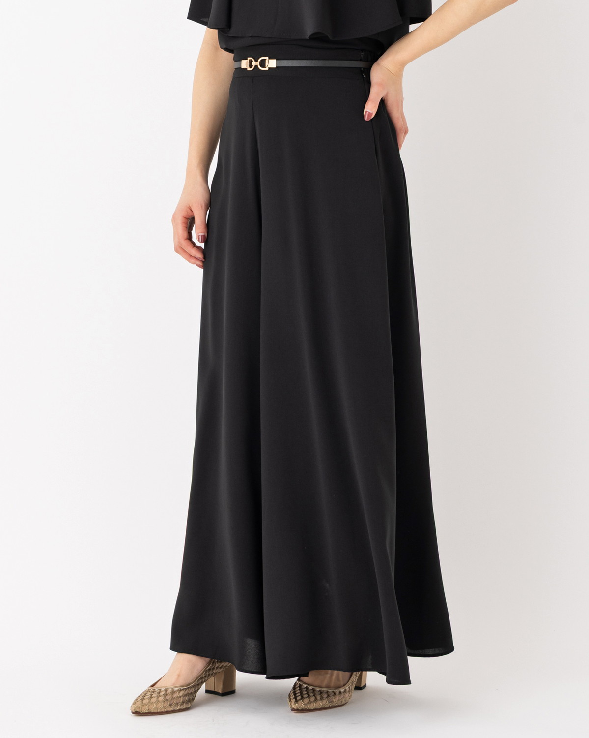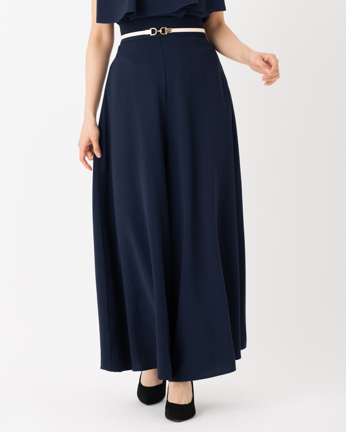 シーンを選ばない汎用性: 先ほどの「ラッフル重ねハイネックブラウス」と合わせたエレガントな装いから、Tシャツを合わせた大人カジュアルまで、どんなトップスも最旬のバランスに仕上げてくれます。