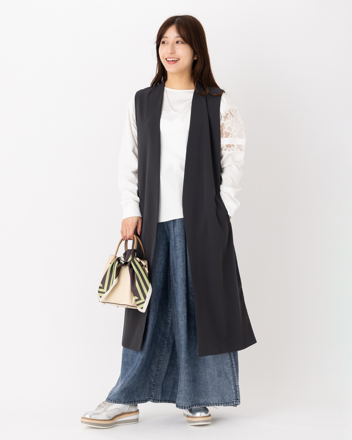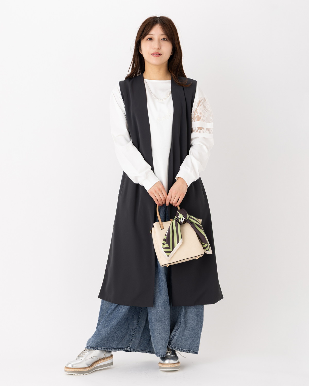 自由自在なレイヤード: サイドが開いているため、ボリューム袖のブラウスや厚手のニットももたつかずに重ねられます。先ほどの「袖切り替えワンポイントビジュTシャツ」や「レースアップスリーブリブニット」との相性も抜群です。