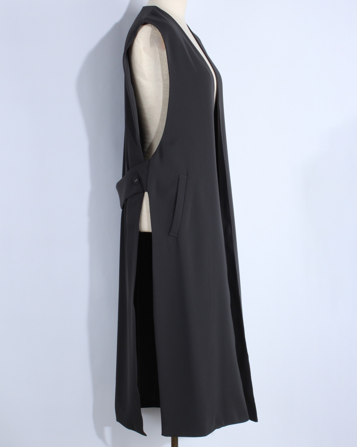 サイドオープンで叶える軽やかさ: 脇を大胆に開けたサイドオープンデザイン。ロング丈の重厚感を程よく逃がし、歩くたびにインナーが覗く、動きのあるドラマチックな着こなしを実現します。